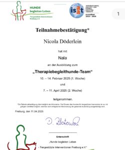 Nala ist eine Goldendoodle Hündin, die im Jahr 2025 zusammen mit der Praxisinhaberin die Ausbildung zur Therapiebegleithündin in Freiburg absolviert hat. Seither bereichert sie die Behandlungen in der Praxis. Ob bei Kindern oder Erwachsenen – sie sorgt für spürbare Entlastung, Zuversicht und Motivation. Nala weiß genau, wann sie „im Dienst“ ist: Wird das Therapiehalsband angelegt und ihre Decke ausgebreitet, schaltet sie sofort in den Arbeitsmodus.